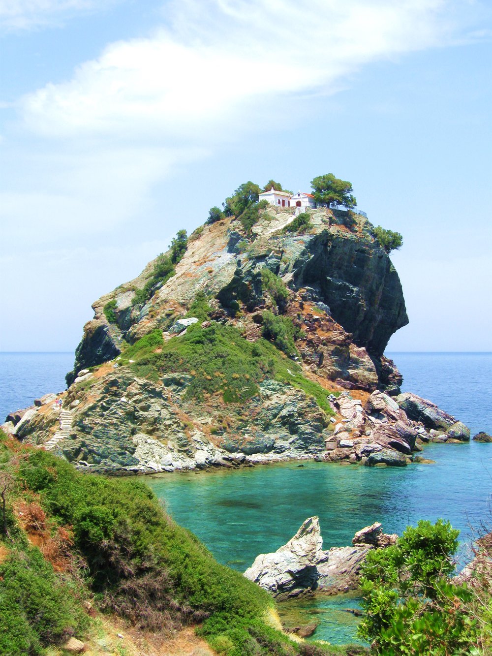 Several scenes of mamma mia were filmed in and around skiathos. The area around the st. Most outdoor scenes of beautiful beaches with crystal clear azure waters and incredible mountainous landscapes and cliffs were at skopelos. The church of agios ioannis kastri (now affectionately referred to as the mamma mia church) is a clifftop church in northeastern skopelos. And the rock where the church sits isn't just any rock—this one is linked to the rest.